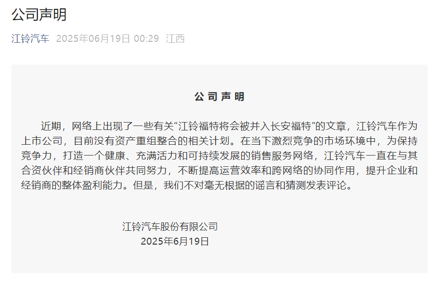 江铃福特将被并入长安福特?江铃汽车回应:目前没有资产重组整合相关计划金风资本江铃福特将被并入长安福特?江铃汽车回应:目前没有资产重组整合相关计划