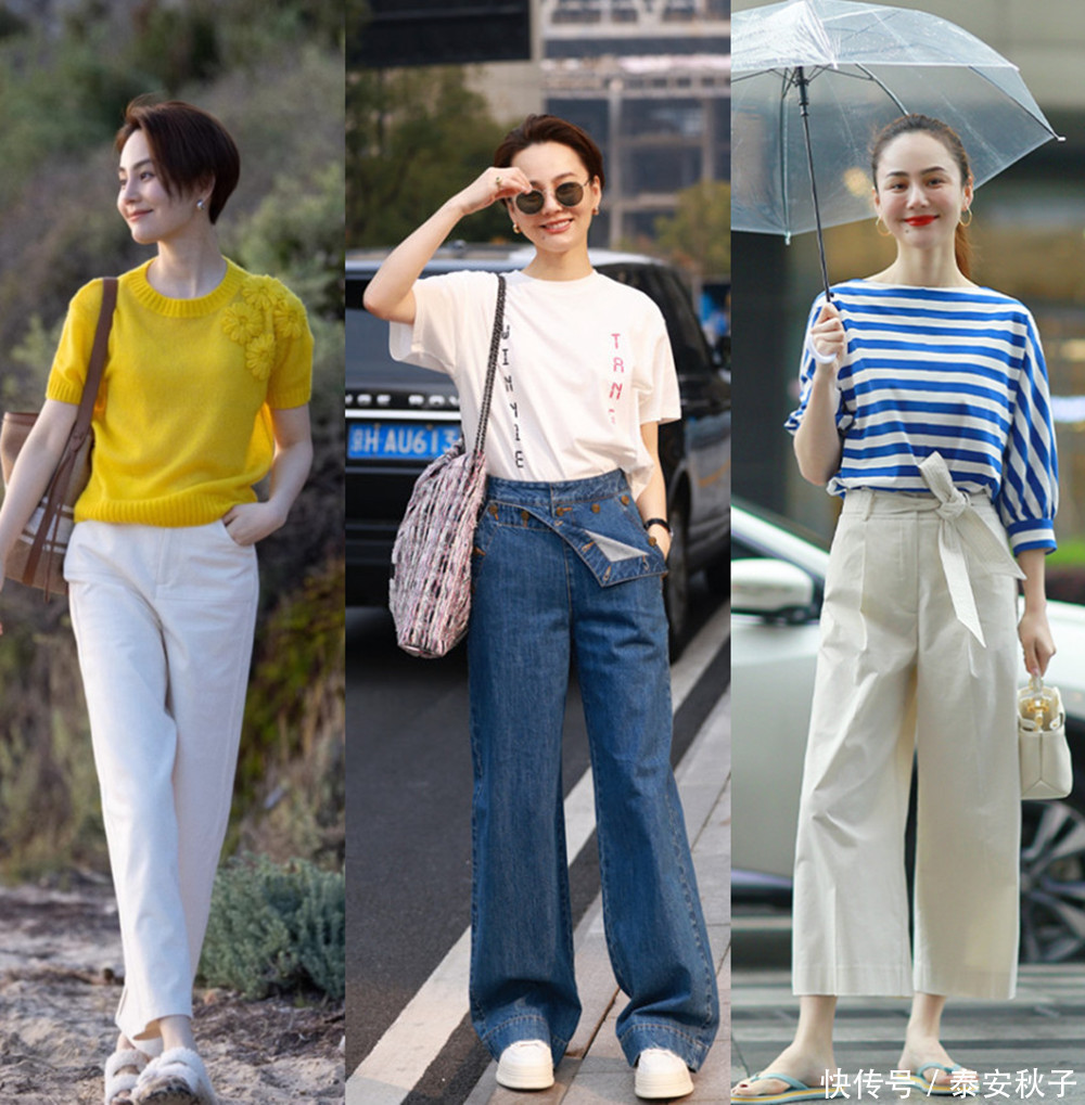 在长裙飘逸的季节里,还是有很多喜欢修身裤装的姐妹,用高腰、休闲裤的穿搭,让整体造型焕发时尚活力。