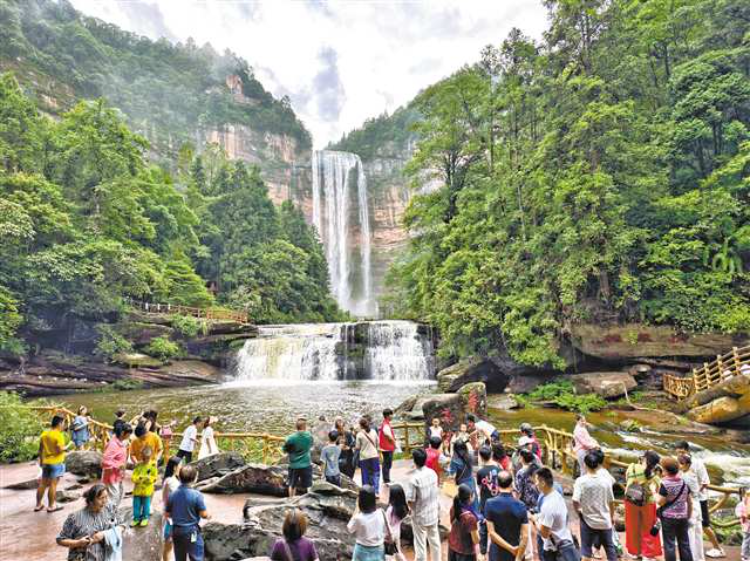 8月16日,重庆市江津区四面山景区望乡台瀑布,众多游客在此赏景。