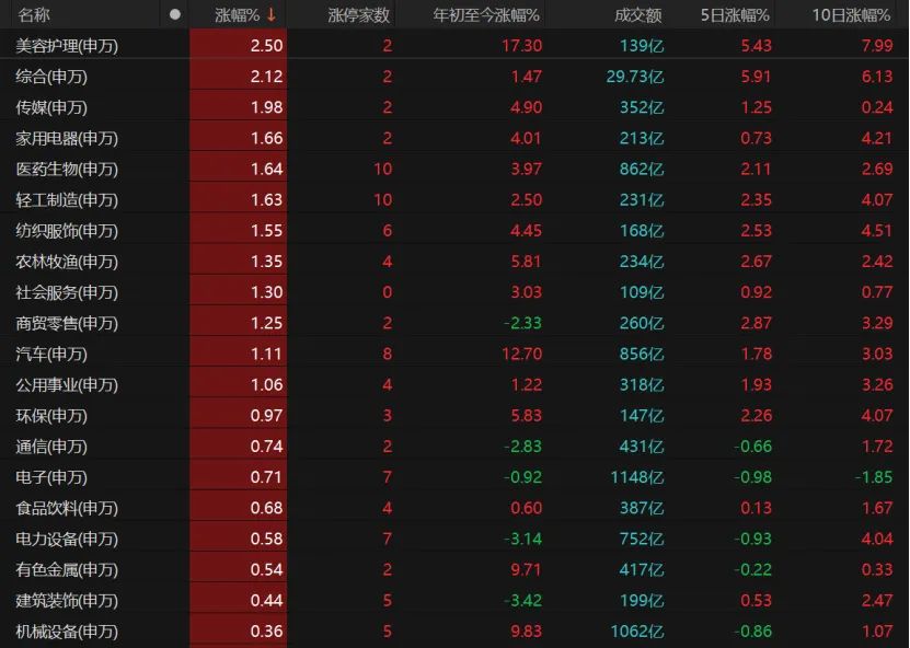 31个申万一级行业中,仅有国防军工、煤炭、钢铁、房地产出现微跌,其余行业飘红。大消费板块领涨,美容护理、综合、传媒、家用电器板块均有不俗表现,医药生物板块涨势也不错,相关个股中有10只涨停,且这些涨停个股主要集中在中小市值医药股。