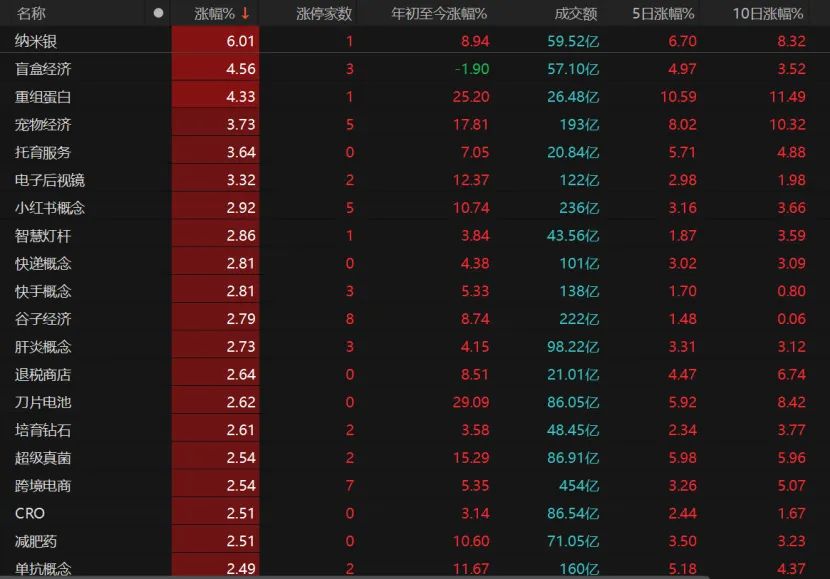 纳米银概念涨逾6%,盲盒经济、重组蛋白、宠物经济、托育服务概念领涨,刀片电池、跨境电商概念同样涨势良好。