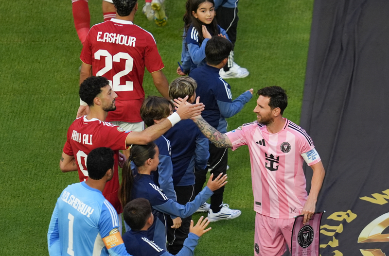 迈阿密国际队球员梅西(右)赛前与开罗国民队球员韦萨姆·阿布·阿里击掌致意。\n 当日,2025年国际足联俱乐部世界杯(世俱杯)揭幕战在美国迈阿密举行,迈阿密国际队0比0战平开罗国民队。\n 新华社记者 黄宗治 摄