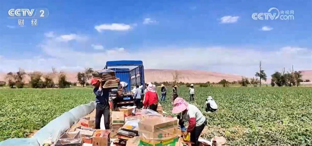 r走进吐鲁番火焰山下的这片西瓜种植基地,翠绿的藤蔓间,圆溜溜、油亮亮的西瓜缀满田间,瓜农穿梭其中采摘、搬运、装车,一派繁忙景象。