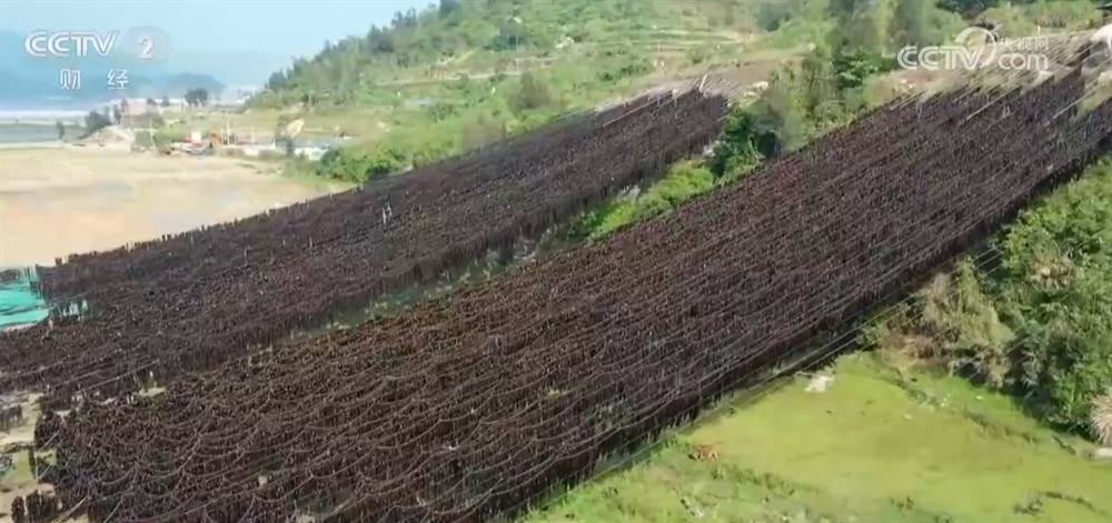 r福建宁德的霞浦县是我国海带的主产区之一。这几天,这里的15万亩海带迎来丰收季,养殖户们把海带收获上岸,再运送到晾晒场晾晒,形成了独特的“空中晒场”景观。