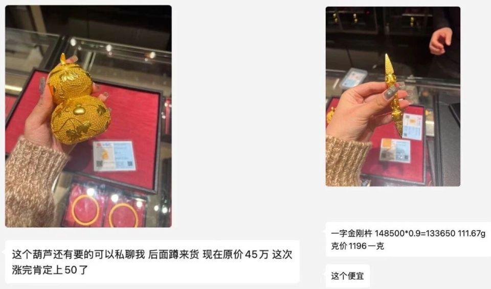 袁佳进了一个老铺黄金的代购群,不管群主发啥,最终都被一抢而空。一个手掌大的金色爬藤葫芦,300多克,原价45万,竟然很快就被人买走,只是因为代购强调的一句:「涨完价肯定就上50万了。」