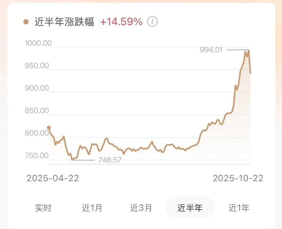 不过到了今年,老铺黄金和黄金之间,还是上演了「一荣俱荣、一损俱损」的剧情。2025年上半年,老铺黄金称由于受原材料成本上涨影响,毛利率下滑到了38.1%,其股价更是跟着大盘金价的走势一路起起落落。比如10月22日,老铺黄金的股价跌幅达到8.21%。