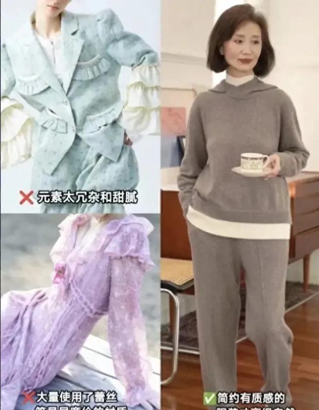 有的时候穿衣打扮过于花哨,确实不太适合中年女性队友,下面这一件衣服元素太沉杂或者是甜美,甚至采用了大量的蕾丝元素,穿在身上之后就会显得廉价,还不如选择简约款纯色系的衣服套装来穿搭好看呢。