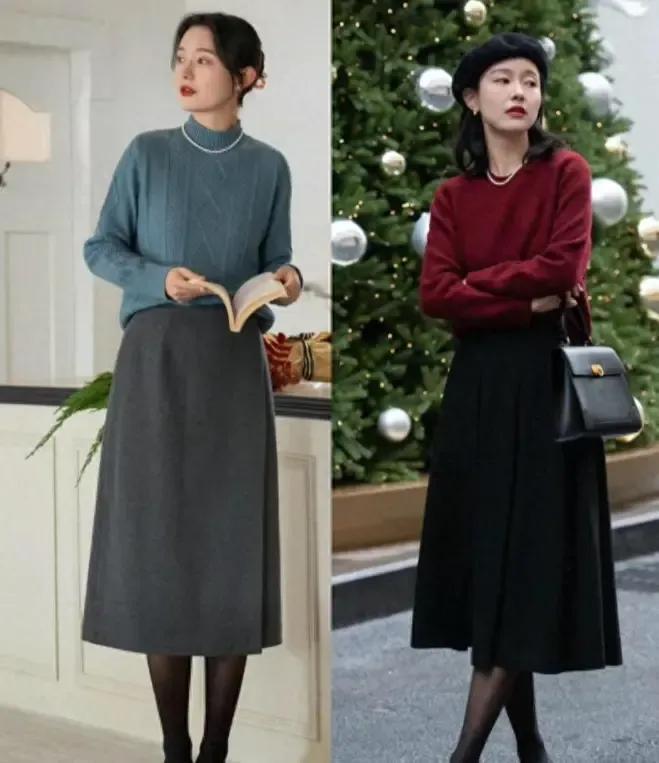 那我们普通大众女性,我们也可以选择一件纯色系的针织上衣,搭配上直筒半身裙,伞状半身裙,这样的穿衣造型优雅得体。
