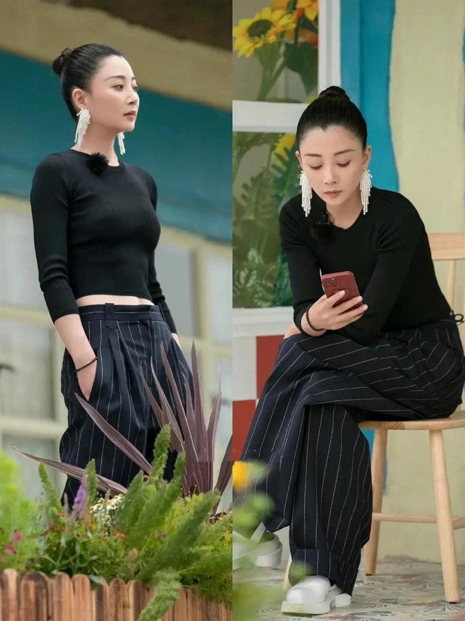 我们选择穿衣打扮,其实没有必要去选择太过于鲜艳的颜色来呈现自己,有的时候选择基础色基础款反而很好看,咱们就来看下面这位女明星,选择一款黑色的打底衫,搭配上条纹的阔腿裤,扎的一款高高的丸子头发型,再搭配上比较夸张的耳坠,虽然他也是奔四奔五的年龄,但是整体的气场就有了。