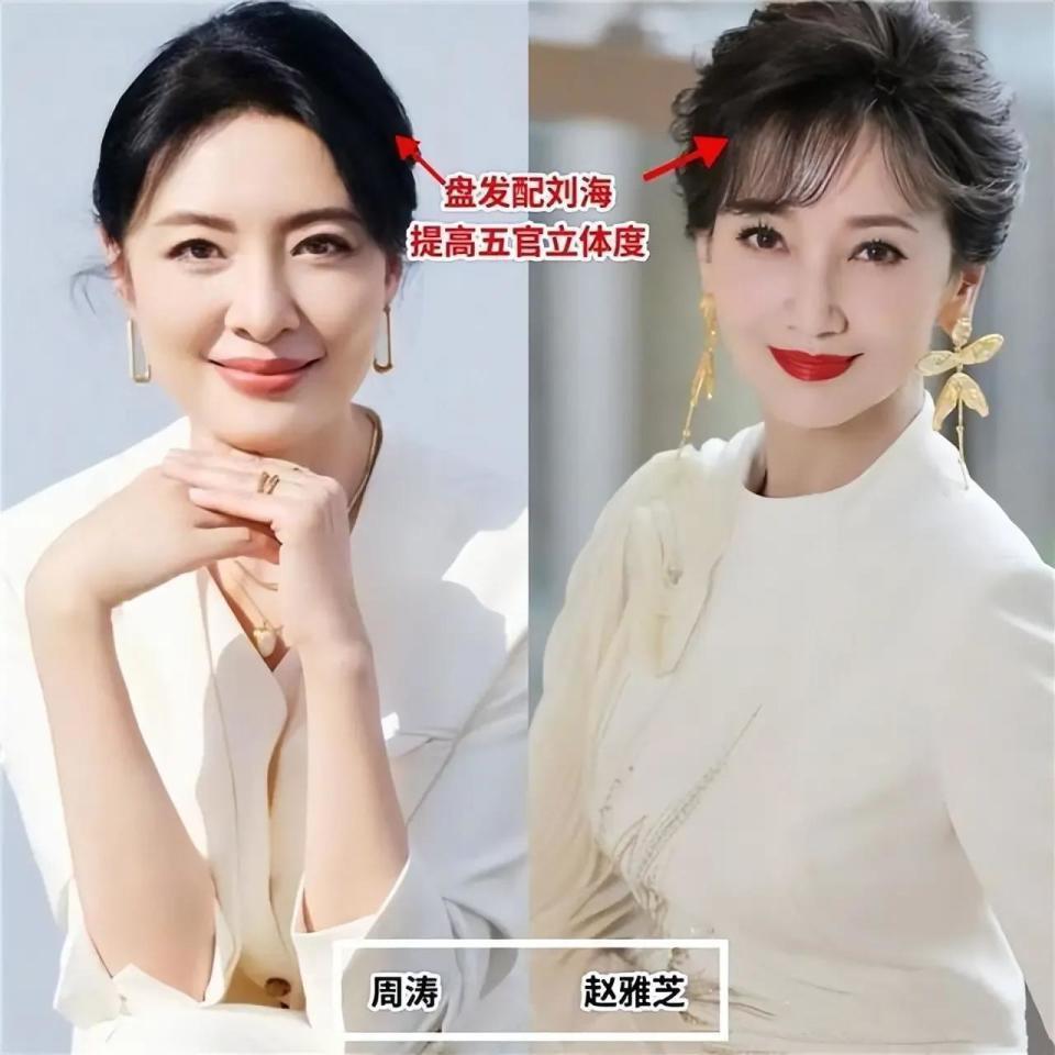 如果是五六十岁的中年女性,这时候想要自己的造型更优雅得体,不管是中长发还是长发造型,需要把头发盘起来,六赵雅芝把头发盘起来之后,再搭配上一款细刘海,提高了五官的立体感,瞬间年轻十岁都不止,再搭配上白色的连衣裙,还有精致的妆容,精致的耳环,这样的穿衣打扮太适合中年女性了。