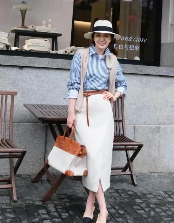 还可以选择蓝白条纹衬衫,内搭一件白色的T恤,加上白色的直筒半身裙,脚上踩着一双拼接色的浅口单鞋,头上戴着一款草帽,这样的穿衣打扮很适合出门旅游穿搭,拍出来的照片很出片。